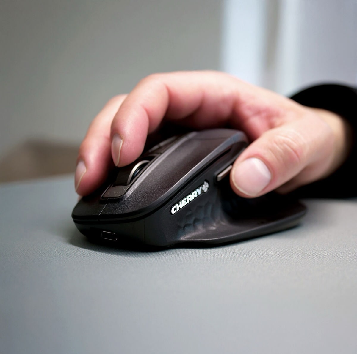 Die Maus selbst kommt mit einer ergonomischen Form und strukturierter Daumenauflage. Sieben Tasten sind verbaut, darunter zwei Seitentasten und ein Schalter für DPI und Profile. Der DPI-Bereich liegt zwischen 1000 und 4000. Verbinden lässt sich die Maus per Dual-Bluetooth 5.2, über 2,4 GHz Funk oder per USB-C-Kabel. Bis zu vier Geräte kann man gleichzeitig koppeln. Optisch setzt CHERRY auf schwarze Marmor-Akzente und bronzefarbene Details.